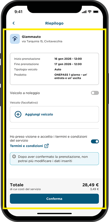 Troverai la tua prenotazione nella sezione I miei ticket con tutte le informazioni utili relative a eventuale possibilità di cancellazione e modalità di accesso al parcheggio.