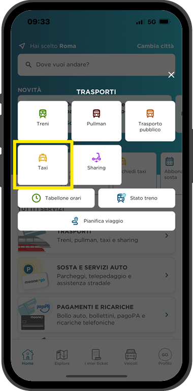 Accedi all’app MooneyGo, entra nella sezione “Trasporti” e seleziona “Taxi”.