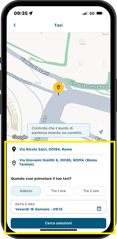 Scegli la tua destinazione. Comparirà questa schermata di riepilogo con il tragitto e la data. Clicca su “Cerca soluzioni”.