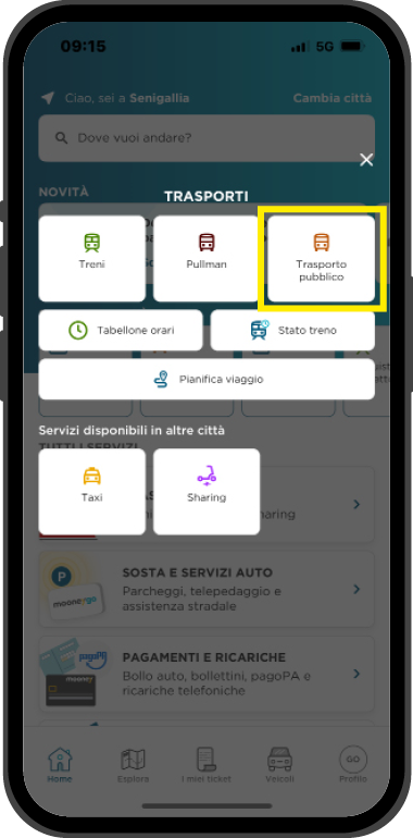 Accedi all’app MooneyGo, entra nella sezione “Trasporti” , e seleziona Trasporto pubblico.